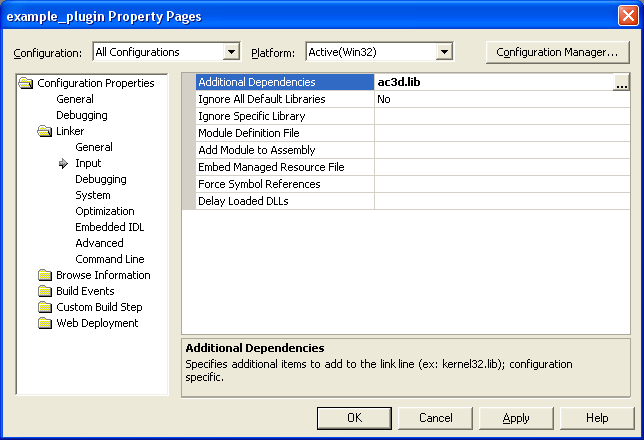 Next, select "Linker -> Input" and set "Additional Dependencies" to "ac3d.lib". If you did not perform the Setting up the compiler step, either do so after you apply this change, or include the library path in your compiler options.